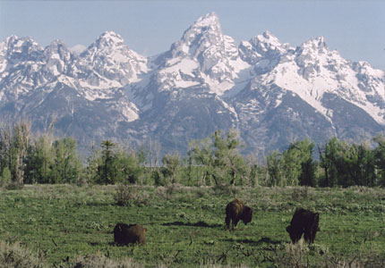 Meanwhile, in Grand Teton Park, the lofty peaks of the Teton Range have retained their toothy appearance because they are made of hard granite and at nine million years old are the youngest peaks in the Rocky Mountains. Seven of the Teton pinnacles exceed 12,000 feet, the tallest peak being the Grand Teton at 13,770! The Tetons are special. After you see them once, you will never forget them! ![]() Bison graze in view of the Grand Teton Range. |